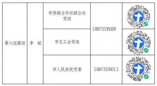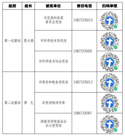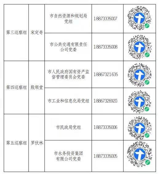 巡察期间,各巡察组设专门值班电话、征求意见箱等,受理反映被巡察党组织领导班子及其成员、市委管理的其他干部及下一级主要负责人、重要岗位主要负责人等问题的来信来电来访,重点是违反政治纪律、组织纪律、廉洁纪律、群众纪律、工作纪律和生活纪律等方面的举报和反映。对其他不属于巡察受理范围的信访问题,将按规定转交有关部门处理。即日起至5月18日受理群众举报。现将各巡察组的值班电话(接听时间为8:00至18:00),以及扫码举报“二维码”予以公布。