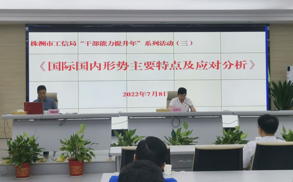 7月8日下午,株洲市工业和信息化局在局五楼会议室,开展了党组理论学习中心组(扩大)第9次专题学习,并邀请了株洲市委宣讲团成员、市委宣传部四级调研员周穆庚教授作了《国际国内形势主要特点及应对分析》的报告。会议由局党组成员、副局长高翔主持,全局干部职工参加。