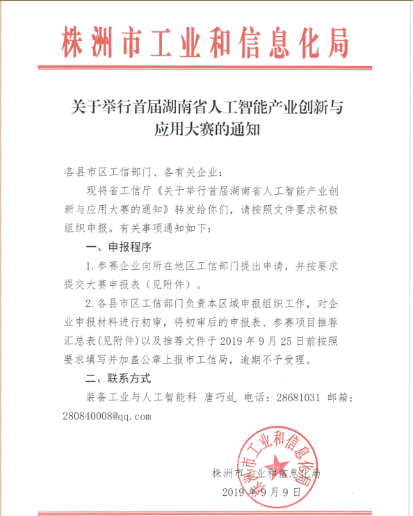 关于举行首届湖南省人工智能产业创新与应用大赛的通知