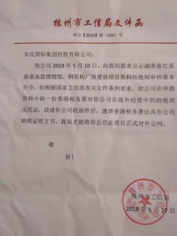 近日,我局获悉宋氏国际集团控股有限公司持有一份《株洲市工信局文件函》(网公〔2019)第(204)号),内容为函请香港税务署出具宋氏国际集团控股有限公司在海外经营中的纳税状况凭证。我局现就此函件郑重通告如下: