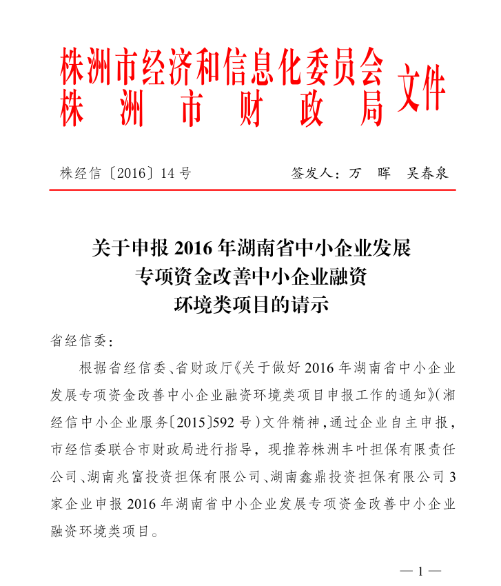 关于申报2016年湖南省中小企业发展专项资金改善中小企业融资环境类项目的请示