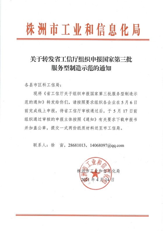 关于转发省工信厅组织申报国家第三批服务型制造示范的通知