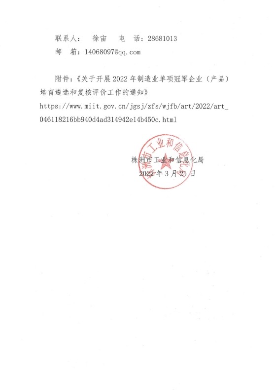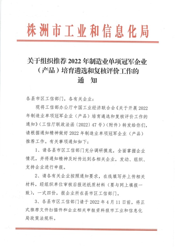 关于组织推荐2022年制造业单项冠军企业(产品)培育遴选和复核评价工作的通知