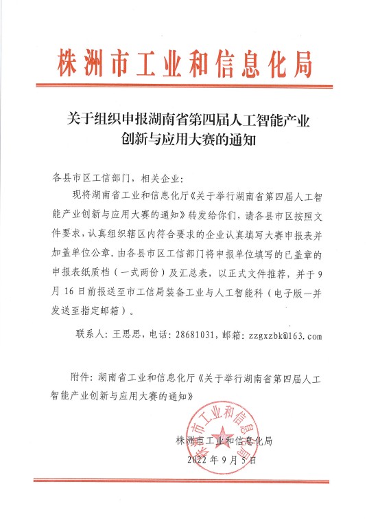 湖南省工业和信息化厅《关于举行湖南省第四届人工智能产业创新与应用大赛的通知》