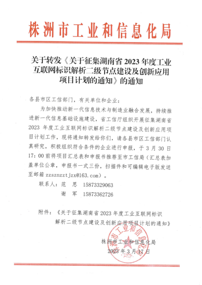 关于转发《关于征集湖南省2023年度工业互联网标识解析二级节点建设及创新应用项目计划的通知》的通知