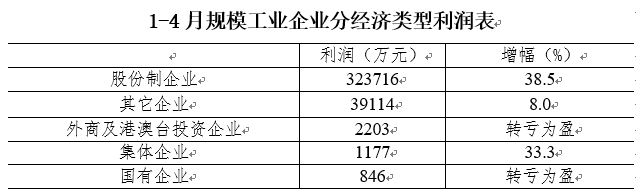 (一)分类型来看,一是中型企业快速增长。1-4月,中型企业实现利润12.10亿元,增长53.6%,较上年同期提高33.7个百分点。二是公有制企业表现突出。1-4月,国有控股企业实现利润14.21亿元,占全市规模工业利润的38.7%,增长66.6%,高于非公有制经济42.7个百分点。三是园区企业贡献最大。1-4月,园区企业实现利润26.94亿元,占全市规模工业利润的73.4%,增长46.4%,贡献率达82.6%,拉动全市增长32.4个百分点。