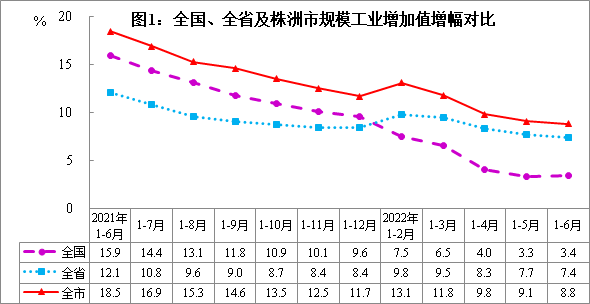 一季度全市规模工业增加值增长11.8%,实现了首季开门红;进入二季度后,受突发疫情影响,4月份工业增长4.8%,当月出现大幅回落,工业生产降至今年来的最低点。随着国内疫情防控形势总体向好和全国稳经济大盘会议精神落地落实,工业经济逐步企稳回升,5、6月份全市规模工业增加值同比分别增长6.5%和7.9%,增速连续两个月加快,企稳回升态势比较明显。从规模工业增加值累计增幅看,1-4月增长9.8%,较一季度回落2个百分点,1-5月增长9.1%,较1-4月回落0.7个百分点,上半年增长8.8%,较1-5月回落0.3个百分点。全市规模工业增加值增幅居全省第2位、A类市第1位,分别高于全国、全省5.4个和1.4个百分点,低于第一位湘西(9%)0.2个百分点,累计增幅回落幅度正逐月收窄。